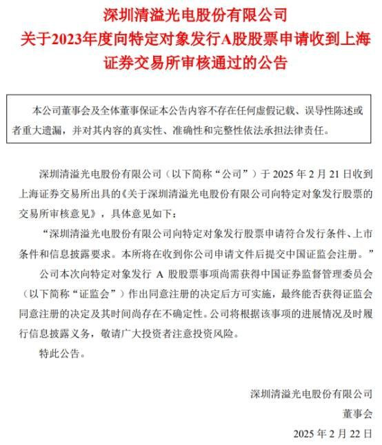 公司于2025年2月21日收到上海证券交往所出具的《对于深圳清溢光电股份有限公司向特定对象刊行股票的交往所审核见地》,公司向特定对象刊行股票苦求合适刊行条款、上市条款和信息清楚要求。上交所将在收到公司苦求文献后提交中国证监会注册。